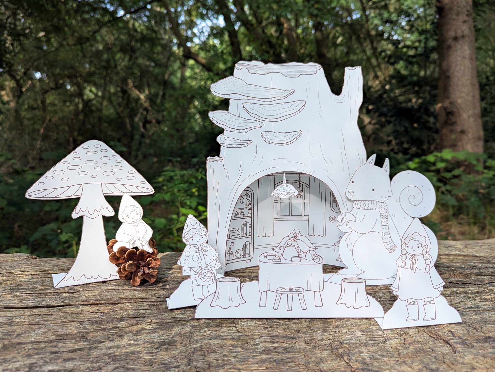 Included in this printable are four gnomes, a squirrel, a ladybug, a snail, a mushroom, a tree trunk cottage with a mushroom lamp and little separate seating area, lots of little leaves to sprinkle around or to make a leaf garland.