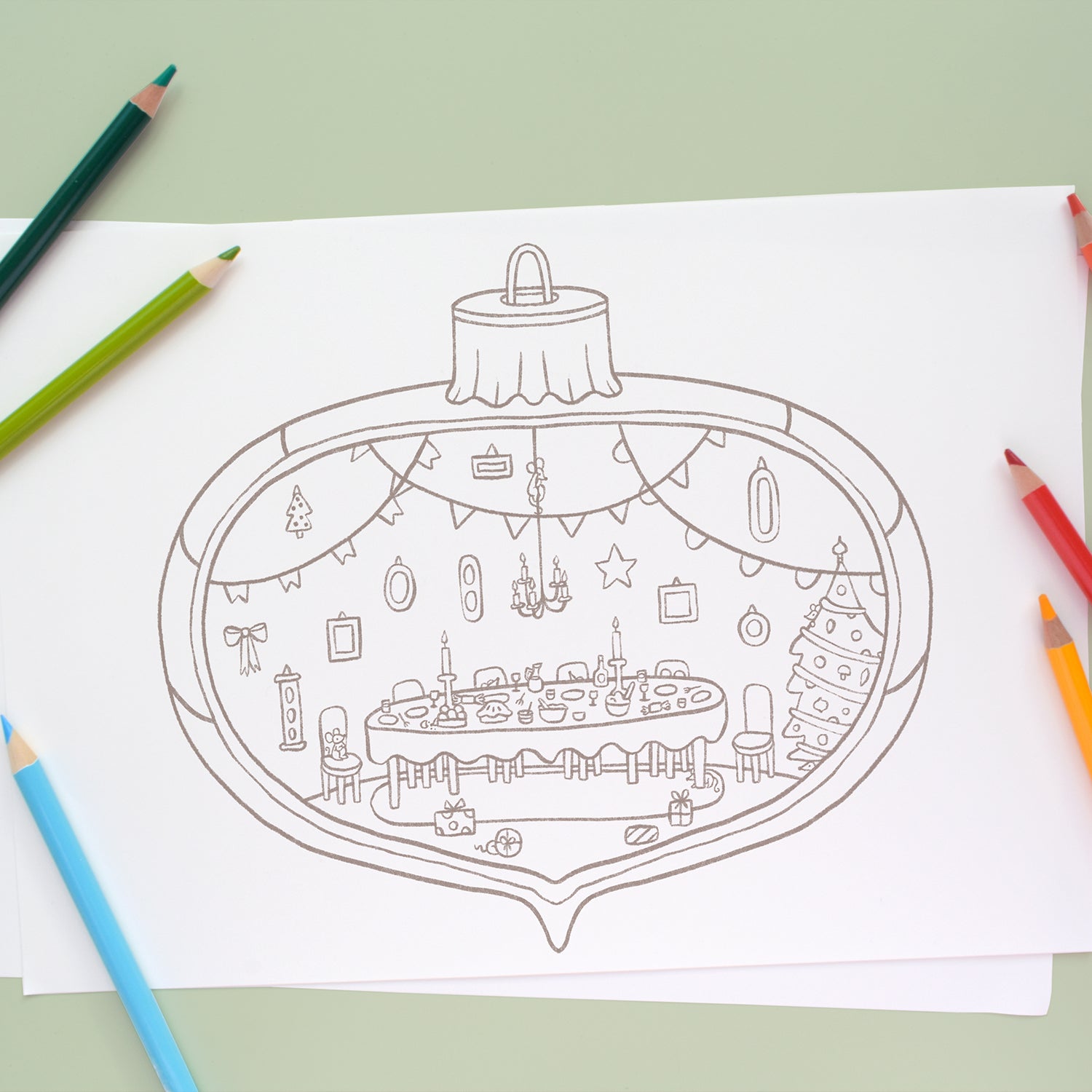 In the mood for a cozy and crafty Christmas afternoon? This coloring page of a Christmas ornament with a miniature dining room (and lots of tiny mice!) inside is the perfect printable project for some creative time during the holidays.